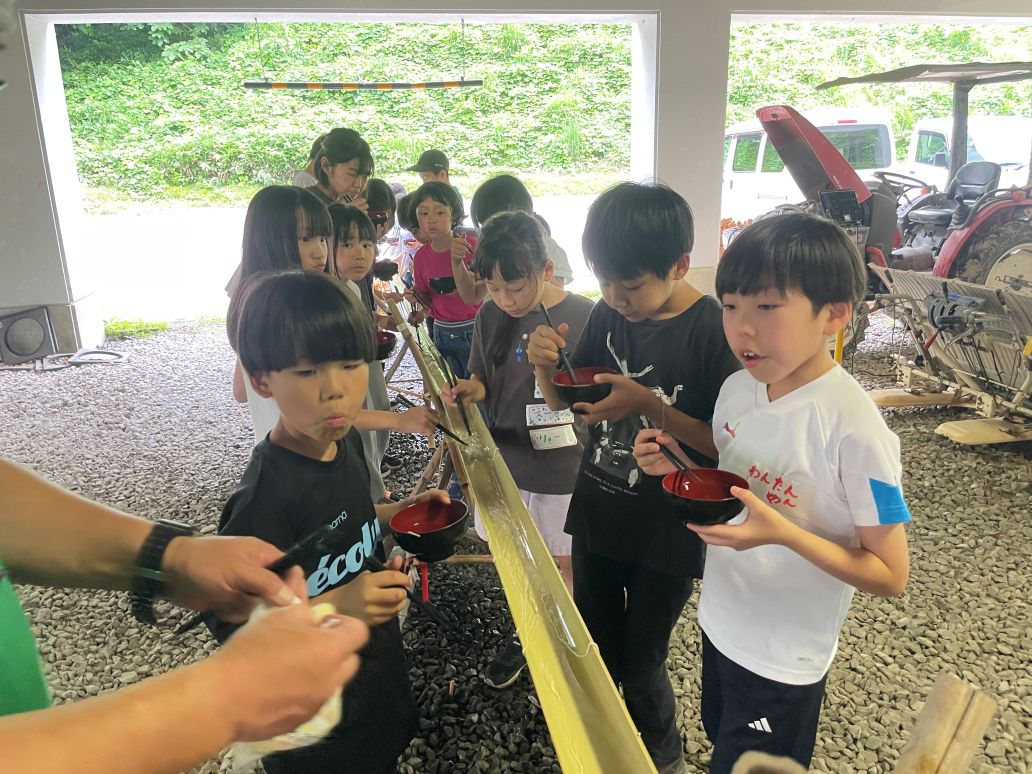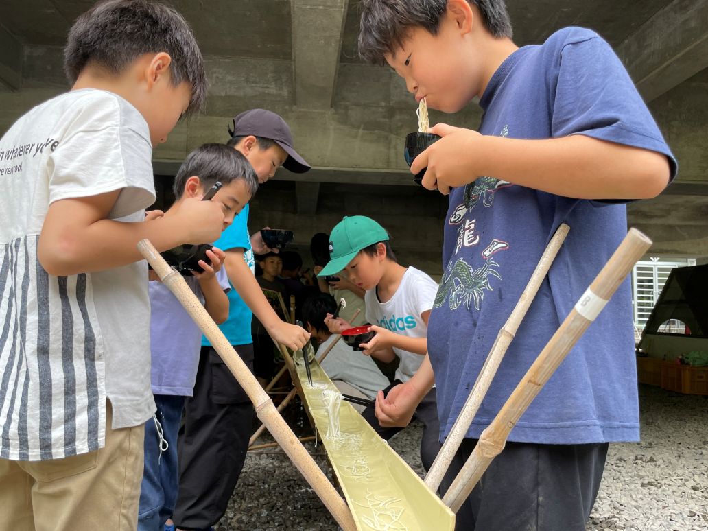 竹で組んだコースにそうめんを流し、みんなで囲んで食べる、涼しさを感じるプログラムです♪