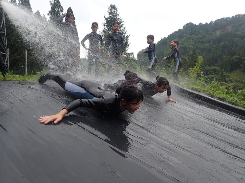 川を流されたり、岩から飛び込んだりとスリル満点の「リバートレッキング」や水鉄砲を使ったバトル「ウォーターサバイバルゲーム」は毎年子どもたちに大好評!ほかにもグラウンドにある小さな山を滑る「ウォータースライダー」、「川魚のつかみ取り&流しそうめん」など、