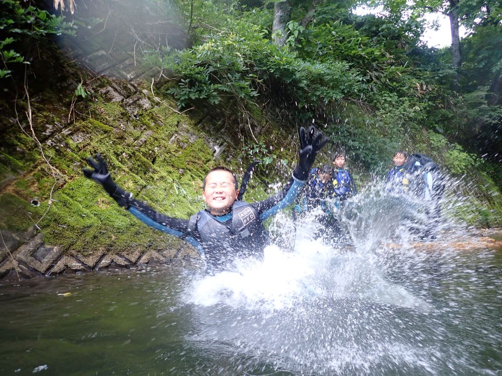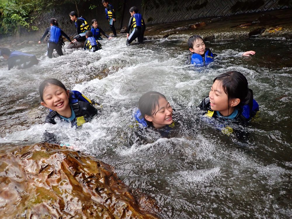 約1kmの川のコースを流されたり、飛び込んだりしながら進む冒険的プログラム!